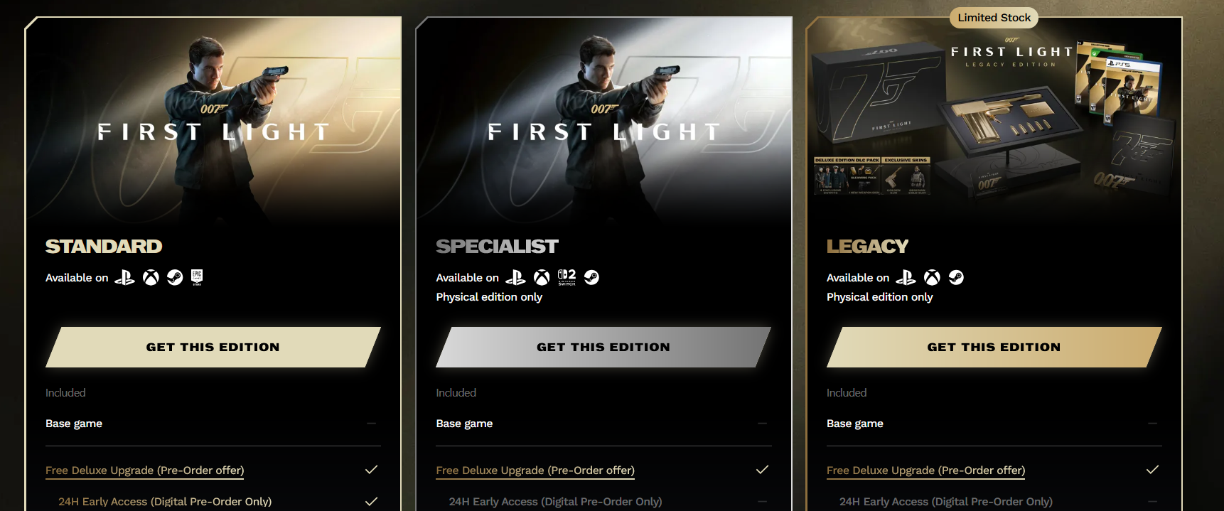 007: First Light "Standard Digital Edition" is priced at £59.99 - a high but increasingly common price point for titles of this calibre. The "Expert Edition" (physical only) offers an extra tuxedo skin for the same price, while "The Legacy Edition" is priced at a hefty £259.95 - this collector bundle includes a steelbook case, in-game skins, and a replica of the iconic golden gun (as seen in The Man With the Golden Gun and the GoldenEye video game). It’s undeniably stylish, but whether it's worth the cost will depend on how much of a 007 fan you are (and how much one can afford). Pre-order bonuses across all editions include 24-hour early access and additional skins for James and his gadgets.
